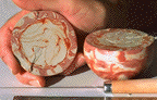 | (10-12)The cylinder-like structure is carefully removed from the cavity, taking care not to allow cracks or distortion to occur. A measuring spoon tool is used to scoop out button-like shapes from the center of the body. These scrap pieces will be used in mother lodes or other work. Taking care not to distort the design, "ring-like" clay parts are then cut away from the inner cavity. The clay ring-like structure is compressed and smoothed so it can be recycled into subsequent pieces (usually of the Santa Monica Style). | ||