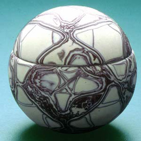 Once attached, the edges of each piece are coated with red oxide slip, then the spaces between the pieces are filled with thick white slip. During the equilibridization stage, the piece is enclosed in an air tight system, and the water distributes itself evenly. During the sphericalization stage, the firm yet plastic piece is made spherical. To begin the sculpting stage, the lid section is cut away from the sphere, and the interiors of both carved out. During the lid-fitting stage, the preformed lid is fitted by gently rotating it in its opening and removing clay from the smudged high points. The last two stages, drying and firing, proceed in the traditional manner.